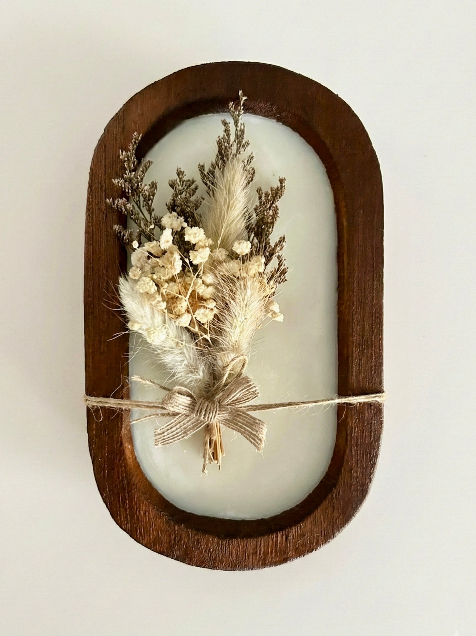 - Natural Aesthetics: The dark wood stain contrasts beautifully with the creamy white wax and neutral dried florals.